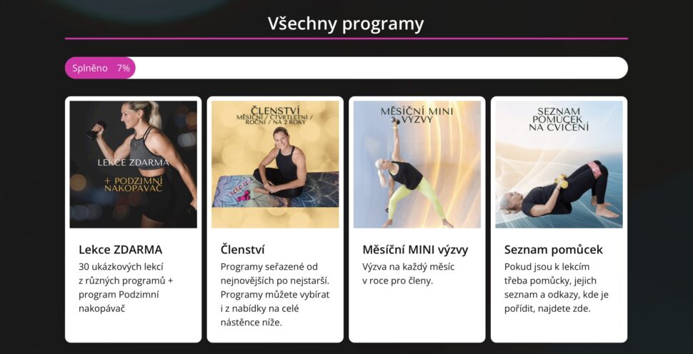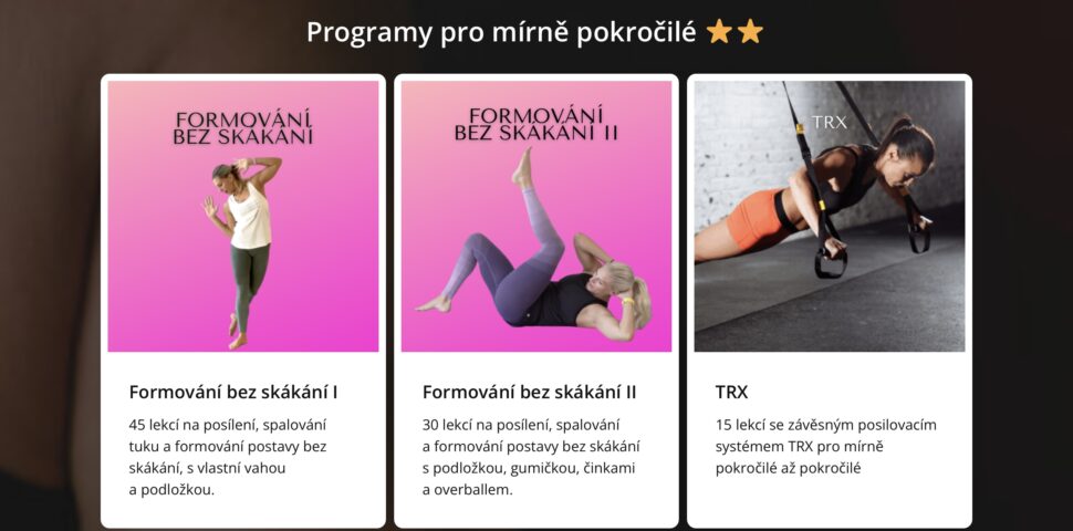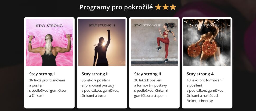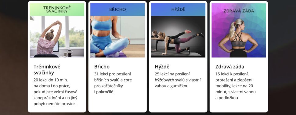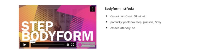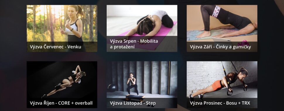- lekce s cvičebními pomůckami i bez nich (podložka, činky, gumička, bosu, step, TRX)